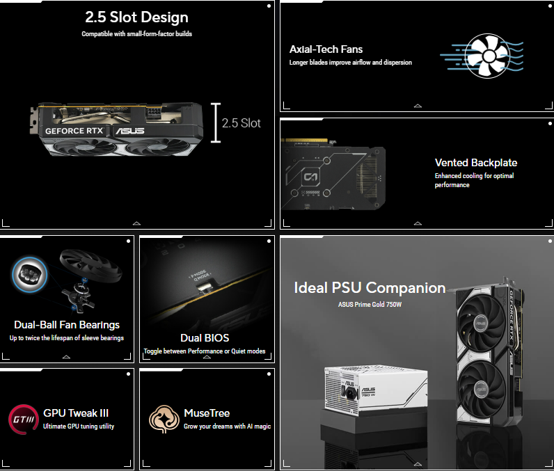 • ASUS Dual GeForce RTX™ 5060 8GB GDDR7 OC Edition (PCIe 5.0, 8GB GDDR7, DLSS 4, HDMI 2.1b, DisplayPort 2.1b, 2.5-Slot Design, Axial-tech Fan Design, 0dB Technology, and More)