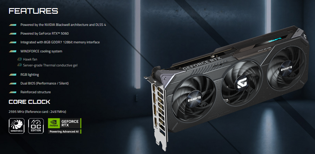 • GIGABYTE GeForce RTX 5060 Gaming OC 8G Graphics Card, 8GB 128-bit GDDR7, PCIe 5.0, WINDFORCE Cooling System, GV-N5060GAMING OC-8GD Video Card