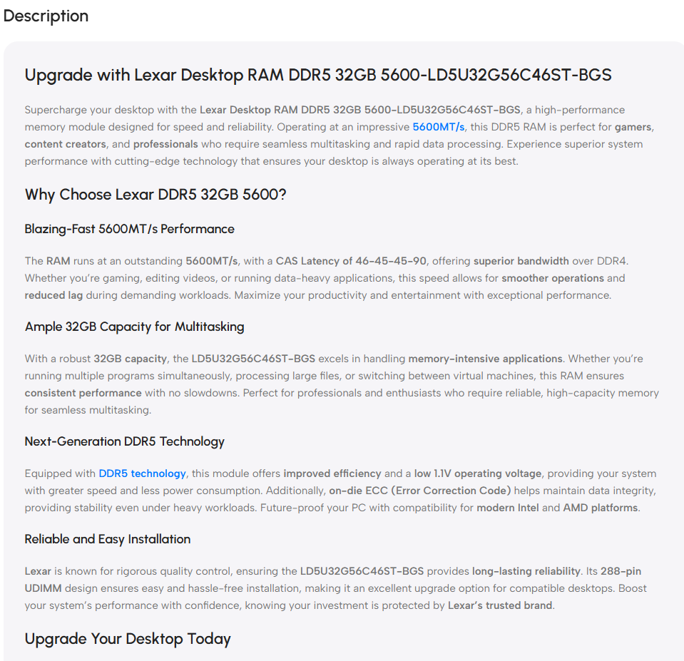 • Lexar UDIMM 32GB DDR5 RAM 5600MHz 288-Pin DDR5 UDIMM Computer RAM, High Performance UDIMM Memory for PC Memory
