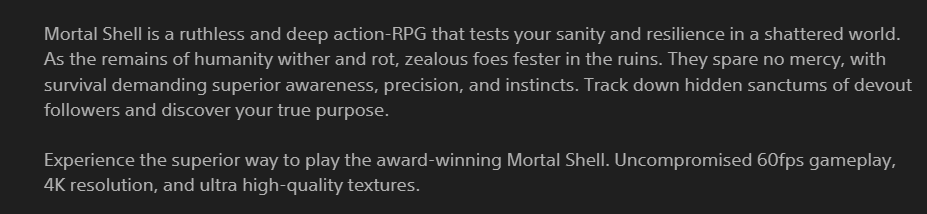 - The lost remains of defeated warriors are yours to discover. Awaken these Mortal Shells, occupy their bodies and significantly open your understanding to diverse masteries of combat