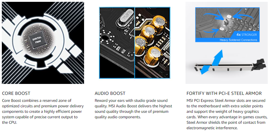 - AUDIO BOOST rewards your ears with studio grade sound quality for immersive gaming experiences.Premium Thermal Solution: Heatsink thermal pad rated for 7W/mk and PCB with 2oz thickened copper.Flash BIOS Button lets users flash the BIOS even without a CPU or memory