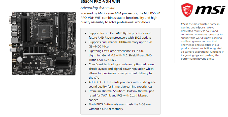 MSI B550M PRO-VDH WiFi ProSeries Motherboard (AMD AM4, DDR4, PCIe 4.0, SATA 6Gb/s, M.2, USB 3.2 Gen 1, Wi-Fi, D-SUB/HDMI/DP, Micro-ATX
