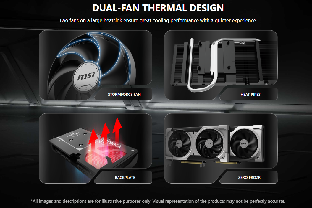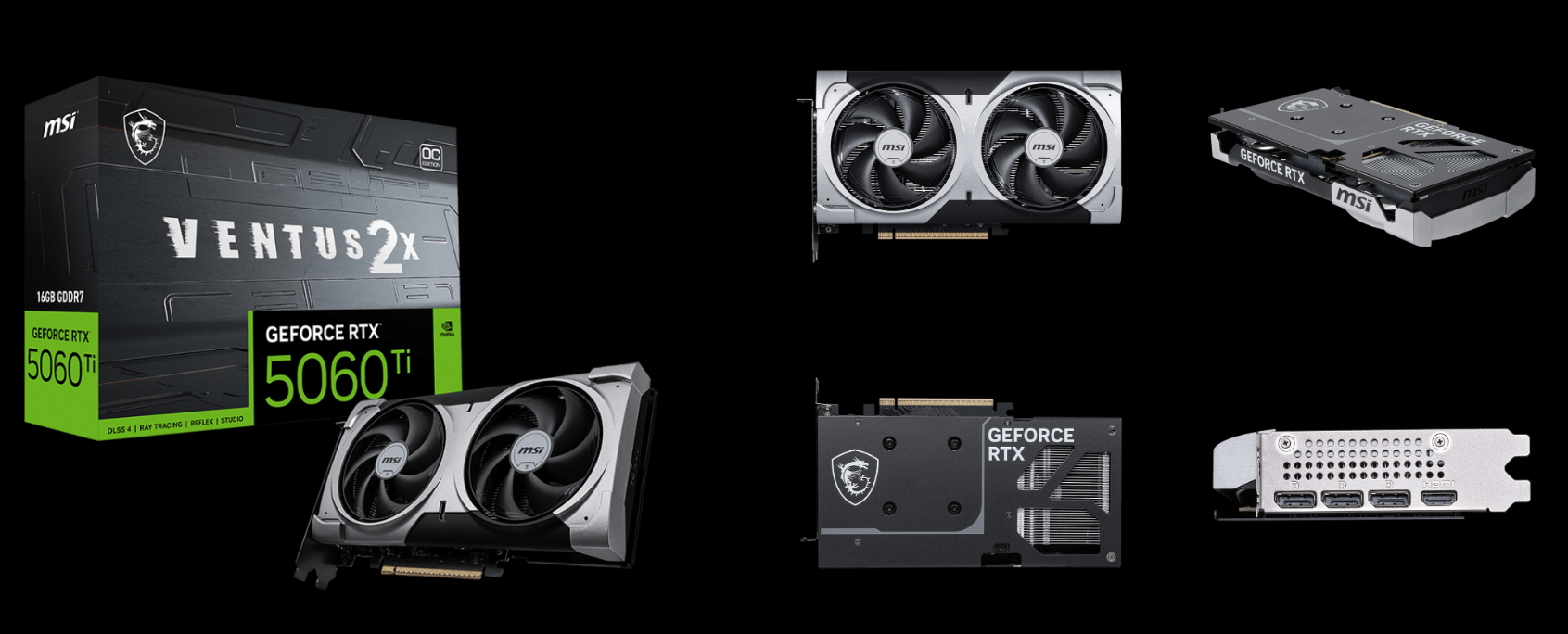 • MSI GeForce RTX 5060 Ti 16G Ventus 2X OC Plus Graphic Card - NVIDIA GeForce RTX 5060 Ti GPU, 16GB GDDR7 128-bit Memory, 28 Gbps, PCI Express Gen 5 x16 Interface, Upto 2602 MHz, STORMFORCE Fan