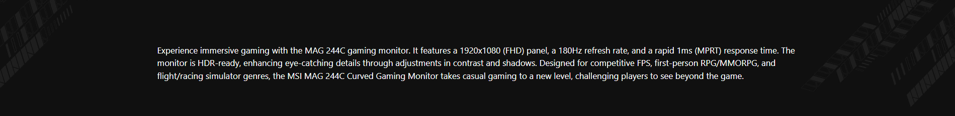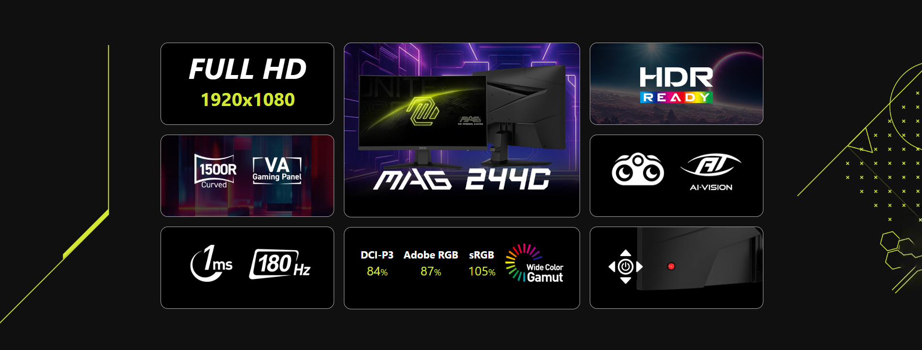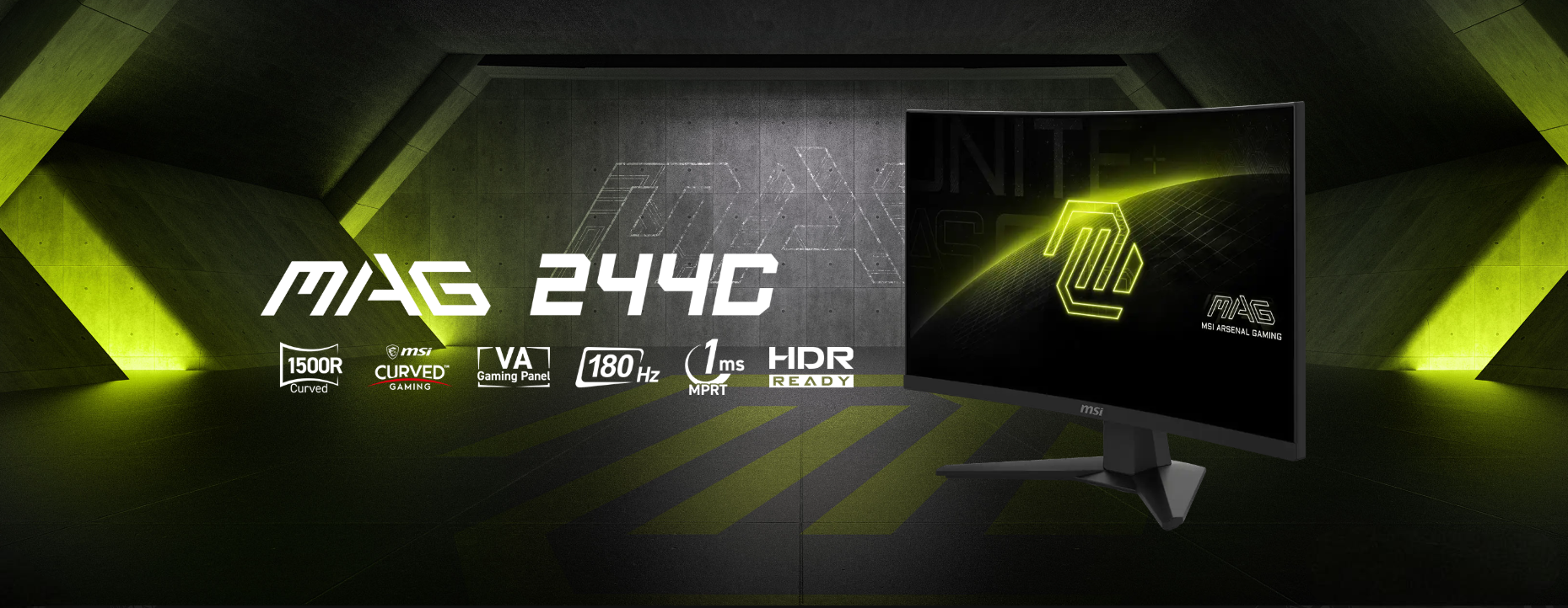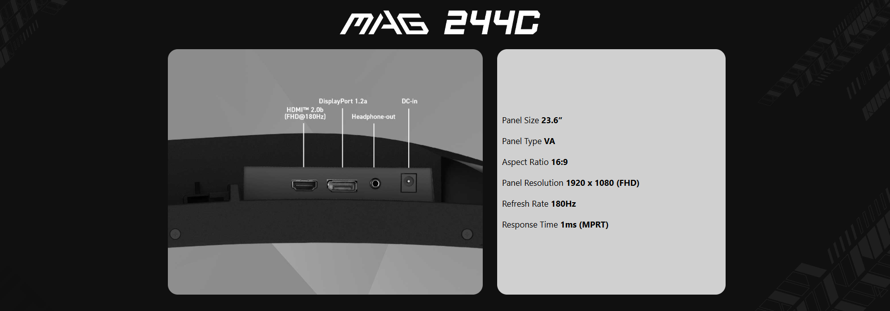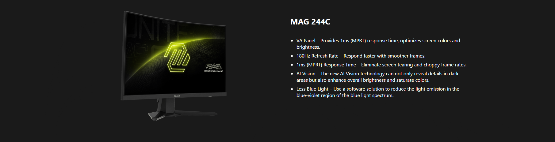 • MSI MAG 244C 24 Inch FHD Curved Gaming Monitor - 1500R 1920 x 1080 VA Panel, 1ms, Adaptive Sync - DP 1.2a, HDMI 2.0b CEC