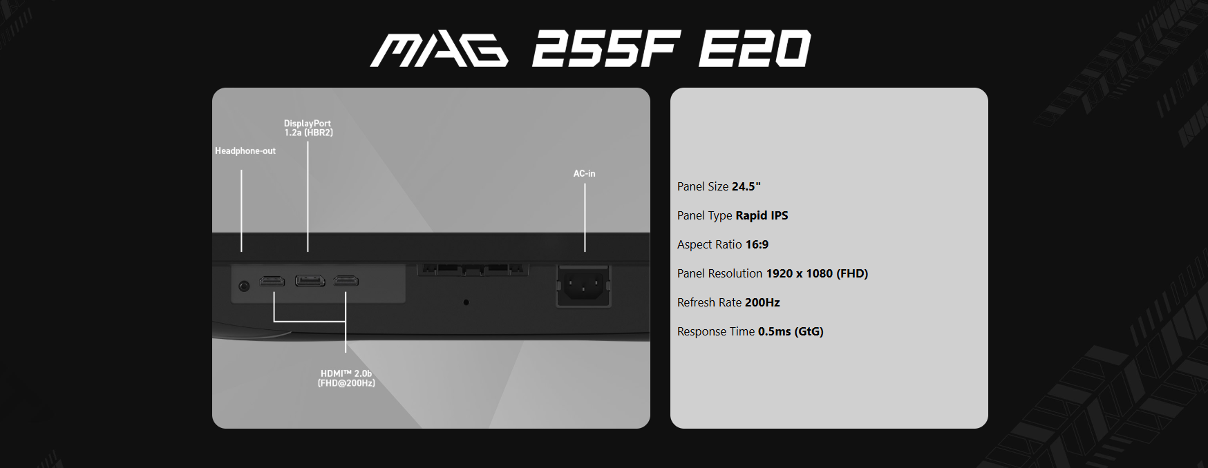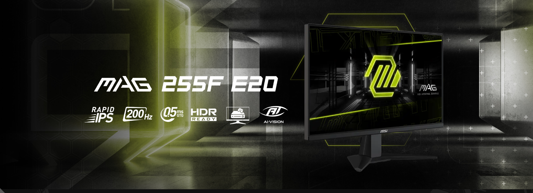MSI MAG 255F E20 25-inch 1920 x 1080 (FHD) Gaming Monitor, 200Hz, Adaptive-Synch, HDMI, DisplayPort, VESA Mountable, Tilt, Height Adjustable, Speaker, 0.5ms, Black