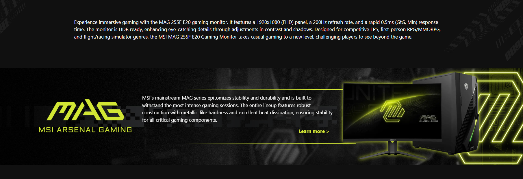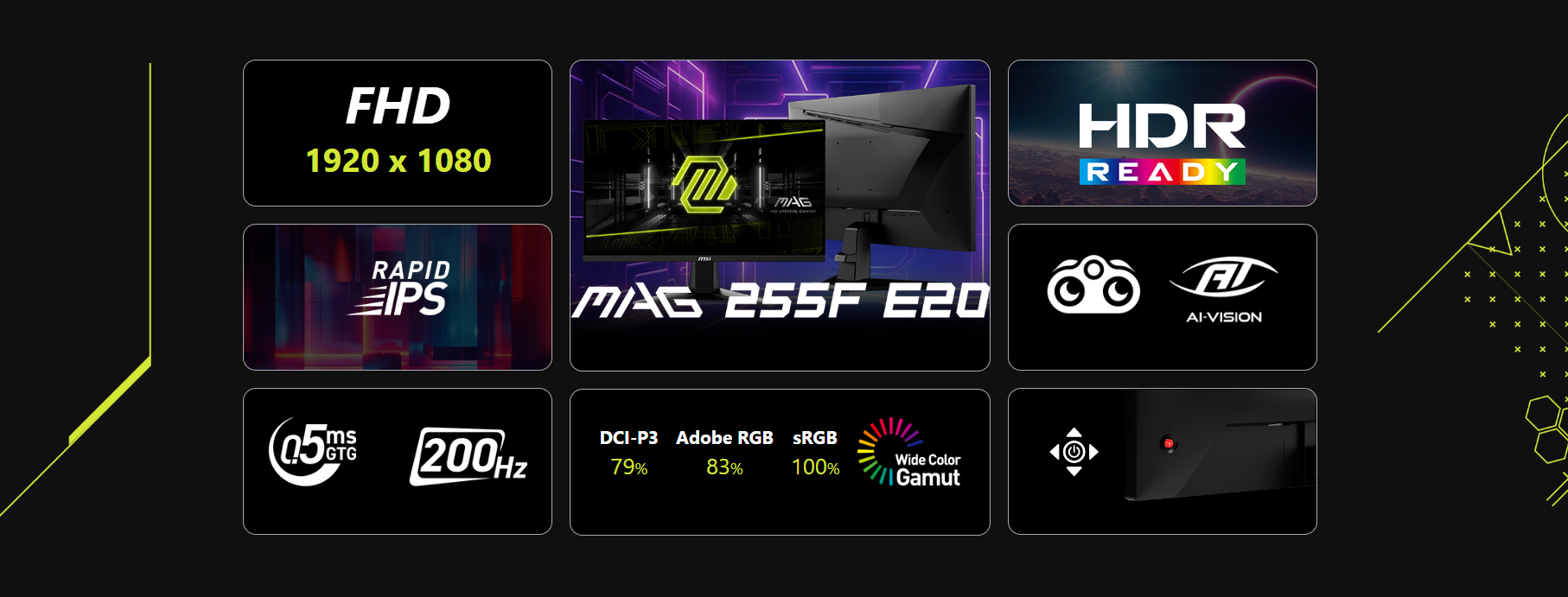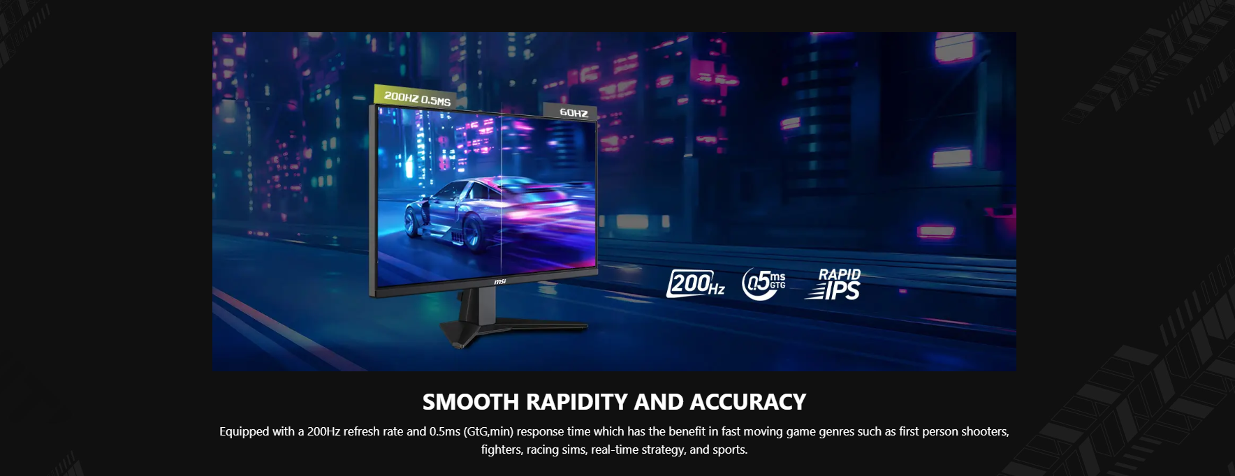 • MSI MAG 255F E20 25-inch 1920 x 1080 (FHD) Gaming Monitor, 200Hz, Adaptive-Synch, HDMI, DisplayPort, VESA Mountable, Tilt, Height Adjustable, Speaker, 0.5ms, Black