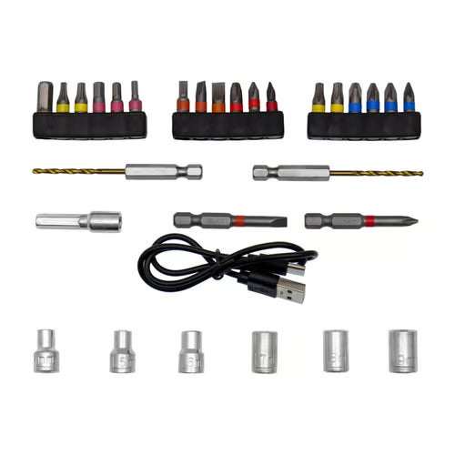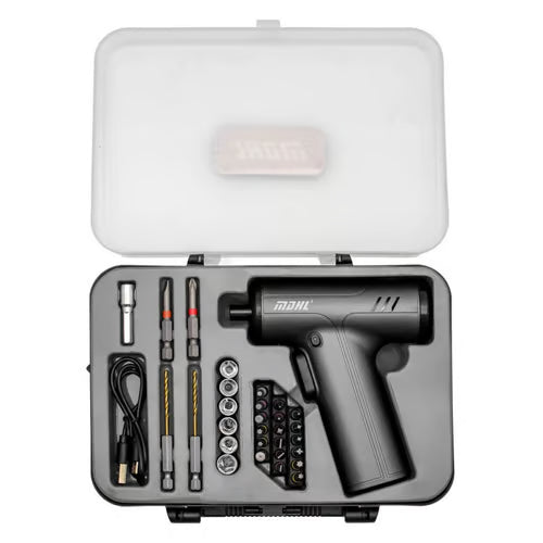 The MDHL MD-8728 cordless screwdriver is one of the most practical home and semi-professional tools with an ergonomic design and a light weight of about 0.3 kg or 300 grams, which makes the work very easy for the user. The MDHL MD-8728 cordless screwdriver is a 30-piece set equipped with a 2000 mAh lithium battery that charges via a USB-C port in approximately 2 to 3 hours. Its free rotation speed is between 0 and 500 rpm and it has the ability to adjust the torque at several different levels so that you can choose the right pressure according to the type of screw.